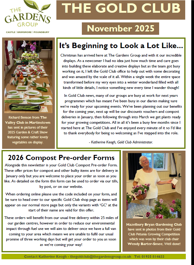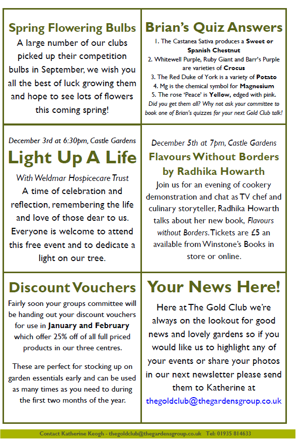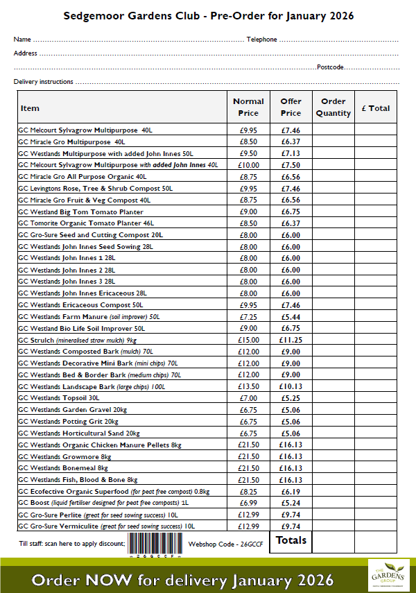 Kelways Plant Centre gives members, 10% off outdoor plants and shrubs on production of our membership card and we can also apply for a club discount card from Overt Locke in Somerton, who give our members a 10% discount on everything.