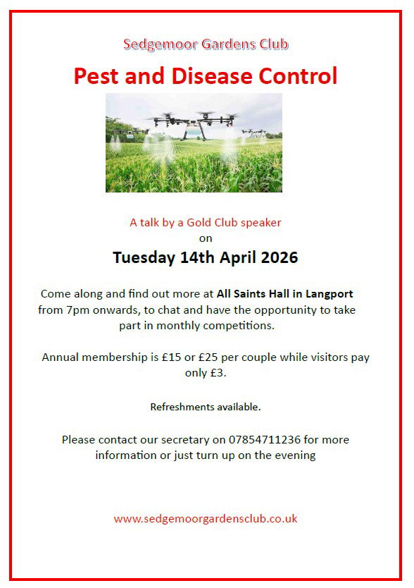 Please contact our secretary, Jean, on 07854 711236 or, as she is often away (lucky thing!) ring 07903030533 to get our President www.sedgemoorgardensclub.co.uk
